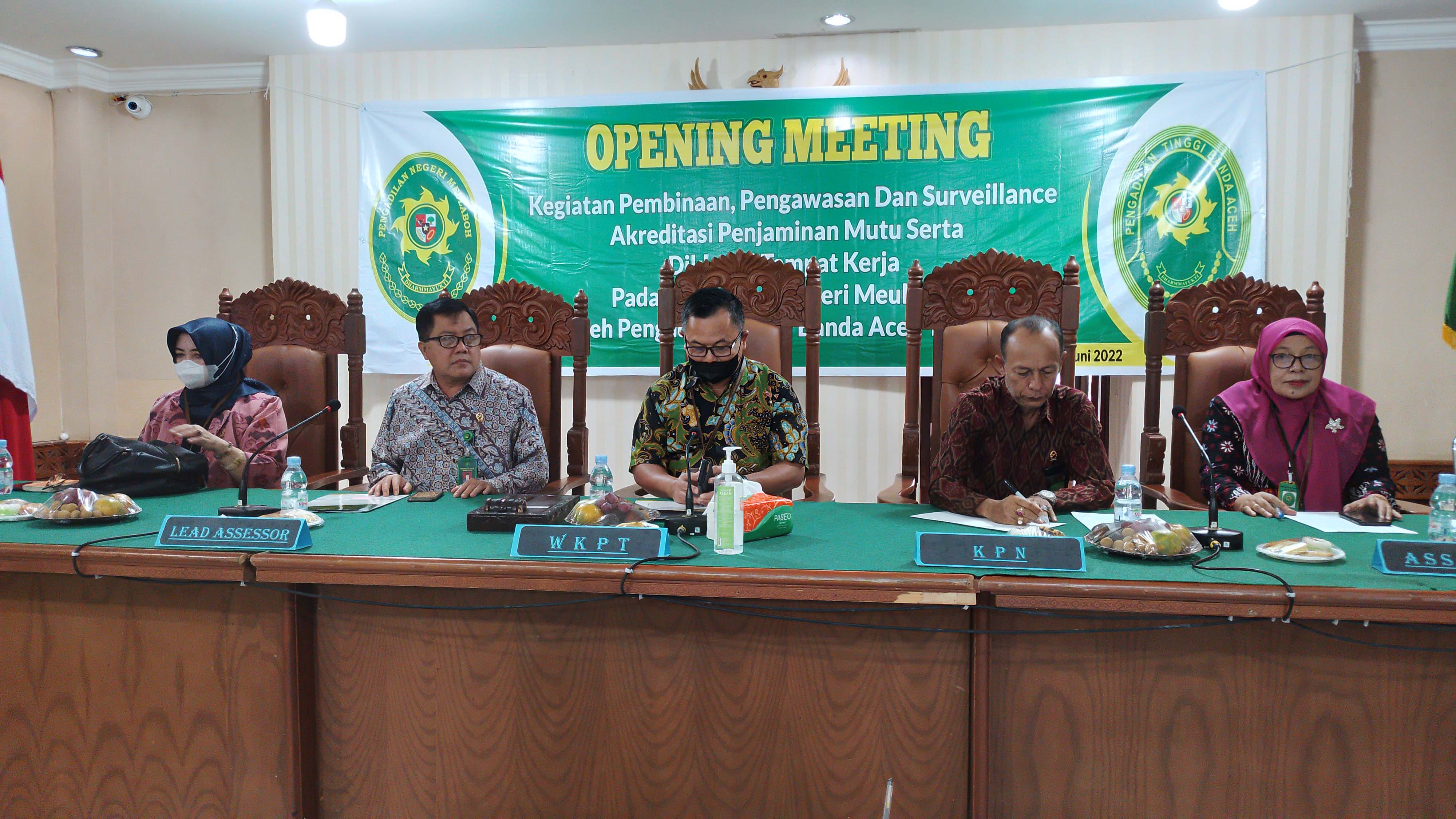 Kegiatan dimulai dengan Opening Meeting pada pukul 08.30 WIB di ruang Sidang Sari Pengadilan Negeri Meulaboh. Dalam sambutannya, Yang Mulia Ketua Pengadilan Negeri Meulaboh Bapak Muhammad Kasim, S.H., M.H. mengucapkan selamat datang kepada Tim Asesor Akreditasi Penjaminan Mutu dari Pengadilan Tinggi Banda Aceh, beliau juga menyampaikan keadaan perkara yang sudah dan yang sedang ditangani, serta kondisi dan formasi aparatur Pengadilan Negeri Meulaboh.