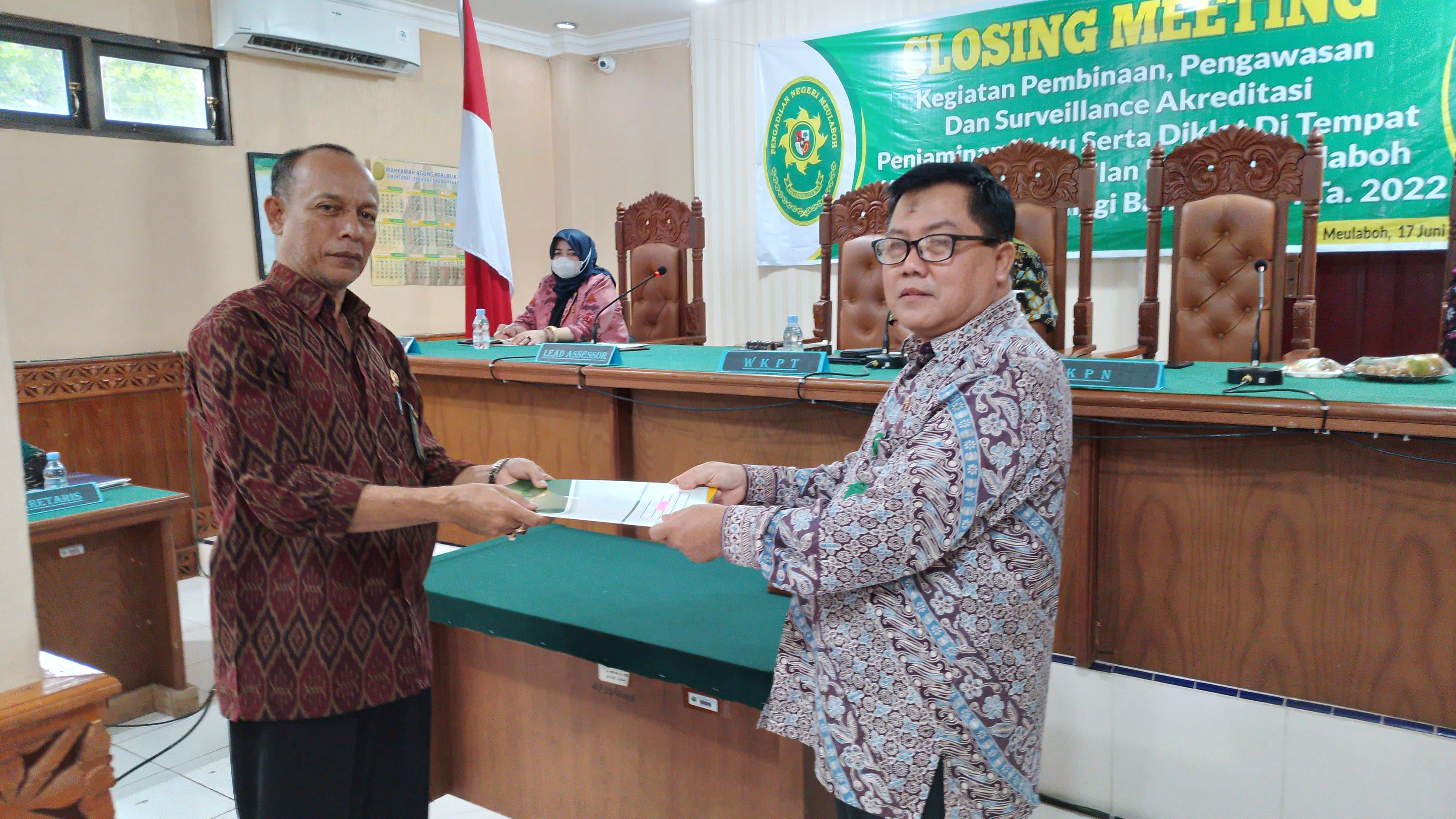 Setiap rangkaian kegiatan yang telah dilakukan, ditutup dengan kegiatan Closing Meeting pada pukul 16.00 WIB. Dalam kegiatan ini, Bapak Fuad Muhammady, S.H., M.H., selaku Ketua Tim Asesor membacakan laporan hasil asesmen yang telah dilakukan, serta menyerahkannya kepada Ketua PN Meulaboh.